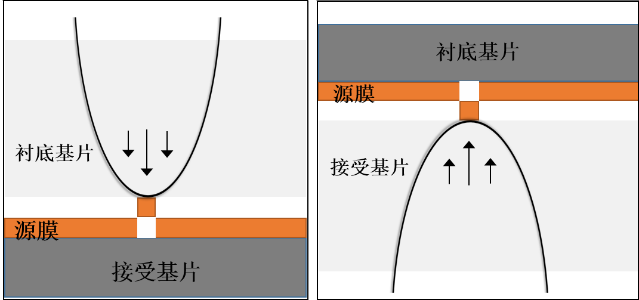 激光誘導(dǎo)前向轉(zhuǎn)移(LIFT)的基本過(guò)程為:高能量脈沖激光光束透過(guò)鍍有薄膜材料(源膜)的透明基片(donor),聚焦到襯底與薄膜的交界面上,使薄膜被加熱至熔融狀態(tài),轉(zhuǎn)移沉積到下面與之平行放置的接受基片上(acceptor substrate)。