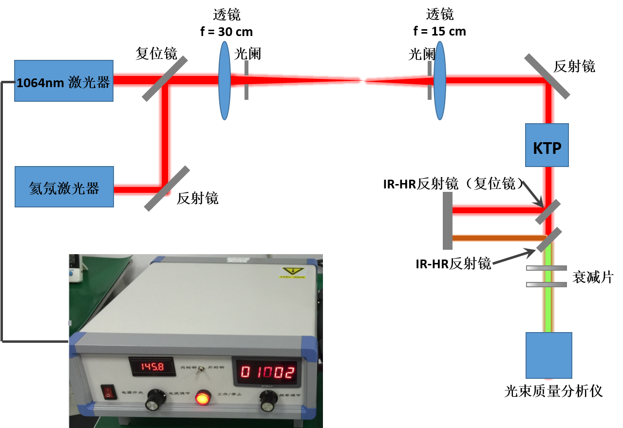 該實驗系統(tǒng)可實現(xiàn)激光器光束質(zhì)量分析、光束直徑測量與光斑發(fā)散角等參數(shù)表征;同時還可以實現(xiàn)光學(xué)元件面形誤差的檢測。在實驗系統(tǒng)的設(shè)計中,我們主要考慮了和倍頻模塊主要利用KTP晶體實現(xiàn) 1064 nm激光的倍頻,對其倍頻走離角和倍頻效率進行分析。光束參數(shù)測量模塊利用光束質(zhì)量分析儀來計算光束質(zhì)量因子與光斑發(fā)射角等參數(shù)。